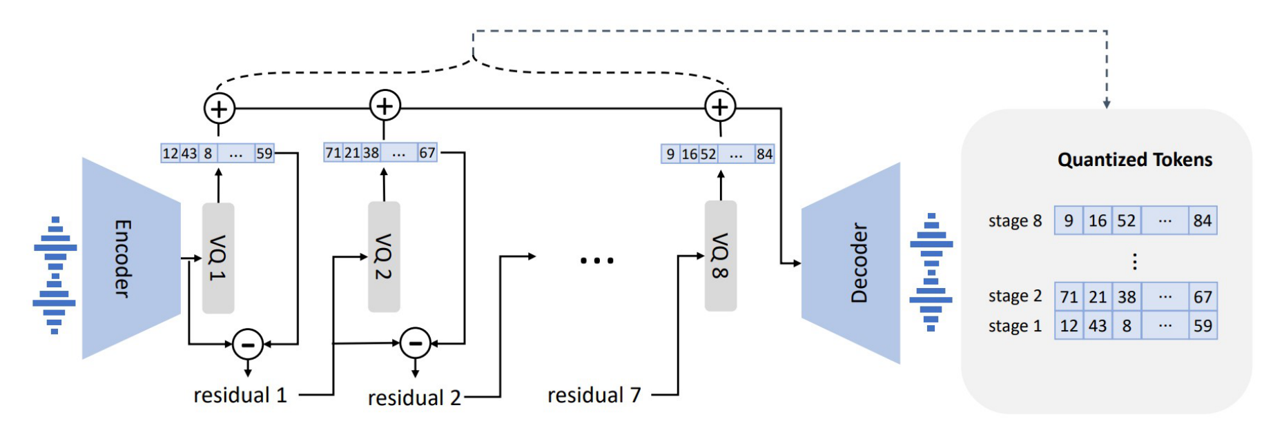 We adopt a pre-trained neural audio codec model, EnCodec [Défossez et al., 2022], as our tokenizer. EnCodec is a convolutional encoder-decoder model, whose input and output are both 24 kHz audio across variable bitrates. The encoder produces embeddings at 75 Hz for input waveforms at 24 kHz,which is a 320-fold reduction in the sampling rate. Each embedding is modeled by a residual vector quantization (RVQ), in which we choose eight hierarchy quantizers with 1024 entries each as shown in Fig.02.