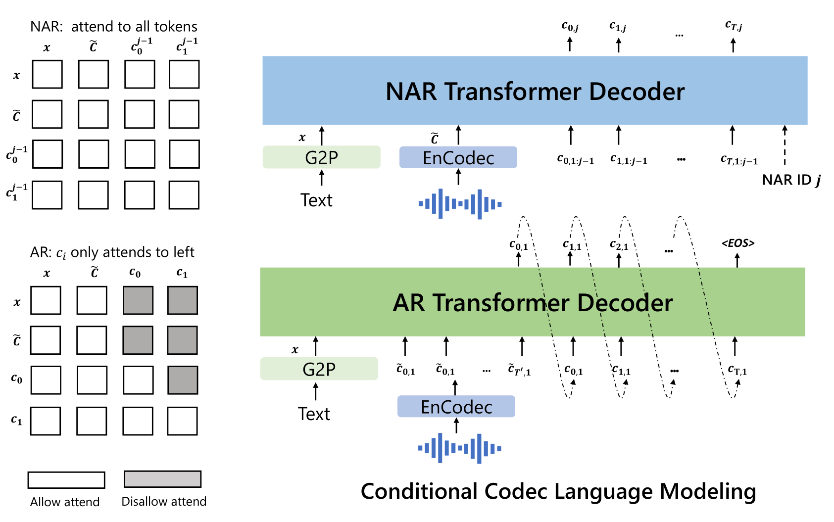 When we obtain the first quantizer codes by the AR model, we employ a non-autoregressive (NAR) model to generate codes of the other seven quantizers. The NAR model has a similar architecture to the AR model, except that it contains eight separate acoustic embedding layers. In each training step, we randomly sample a training stage $i\in [2, 8]$. The model is trained to maximize the acoustic tokens from the $i$-th quantizer codebook. The acoustic tokens from stage $1$ to stage $i−1$ are embedded and summed up as model input: $$ \begin{align}e_{c_{t,j}}&=W_a^j\odot c_{t,j}\tag{4}\\mathbf{e_{c_t}}&=\sum_{j=1}^{i-1}e_{c_t,j}\tag{5}\end{align} $$